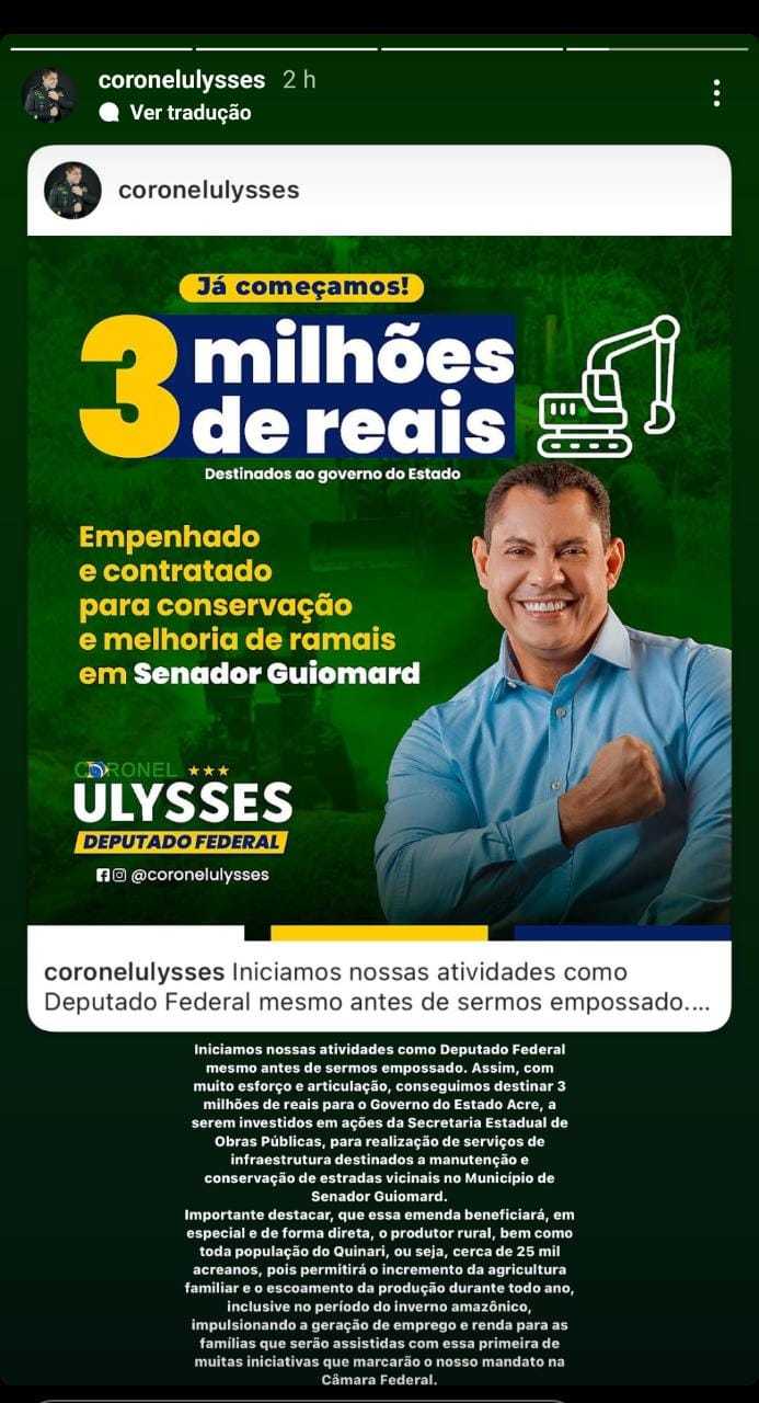 Emenda fantasma: sem tomar posse, Ulysses Araújo afirma ter destinado emenda de R$ 3 milhões para Senador Guiomard
