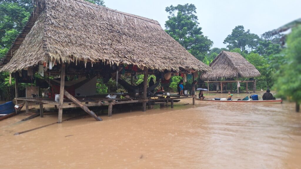 “Na Apiwtxa, muita chuva, o rio Amônia já está muito cheio e todas as famílias já estão em alerta… Para nós da aldeia, já estamos preocupados porque na fronteira, lá na comunidade peruana também está chovendo muito ainda e o rio já está cheio. Já tivemos 27 roçados alagados e algumas famílias já deslocadas para áreas mais altas.”