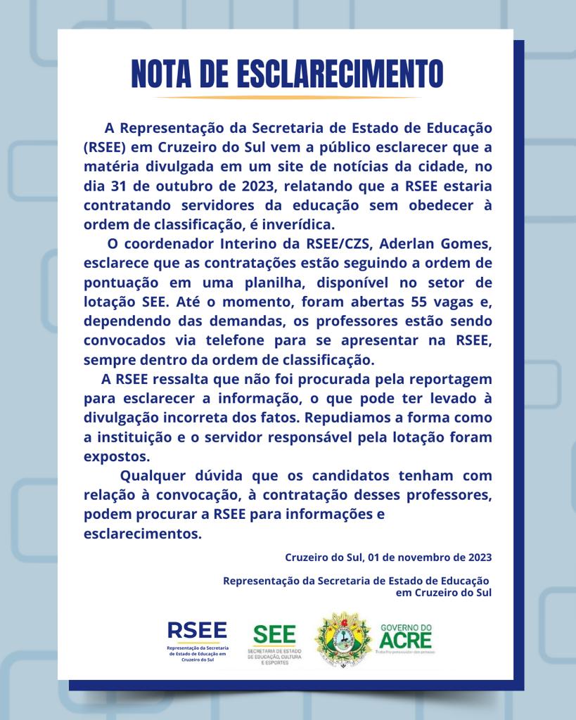 Nota de esclarecimento da RSEE /CZS sobre convocações do processo seletivo de analise curricular