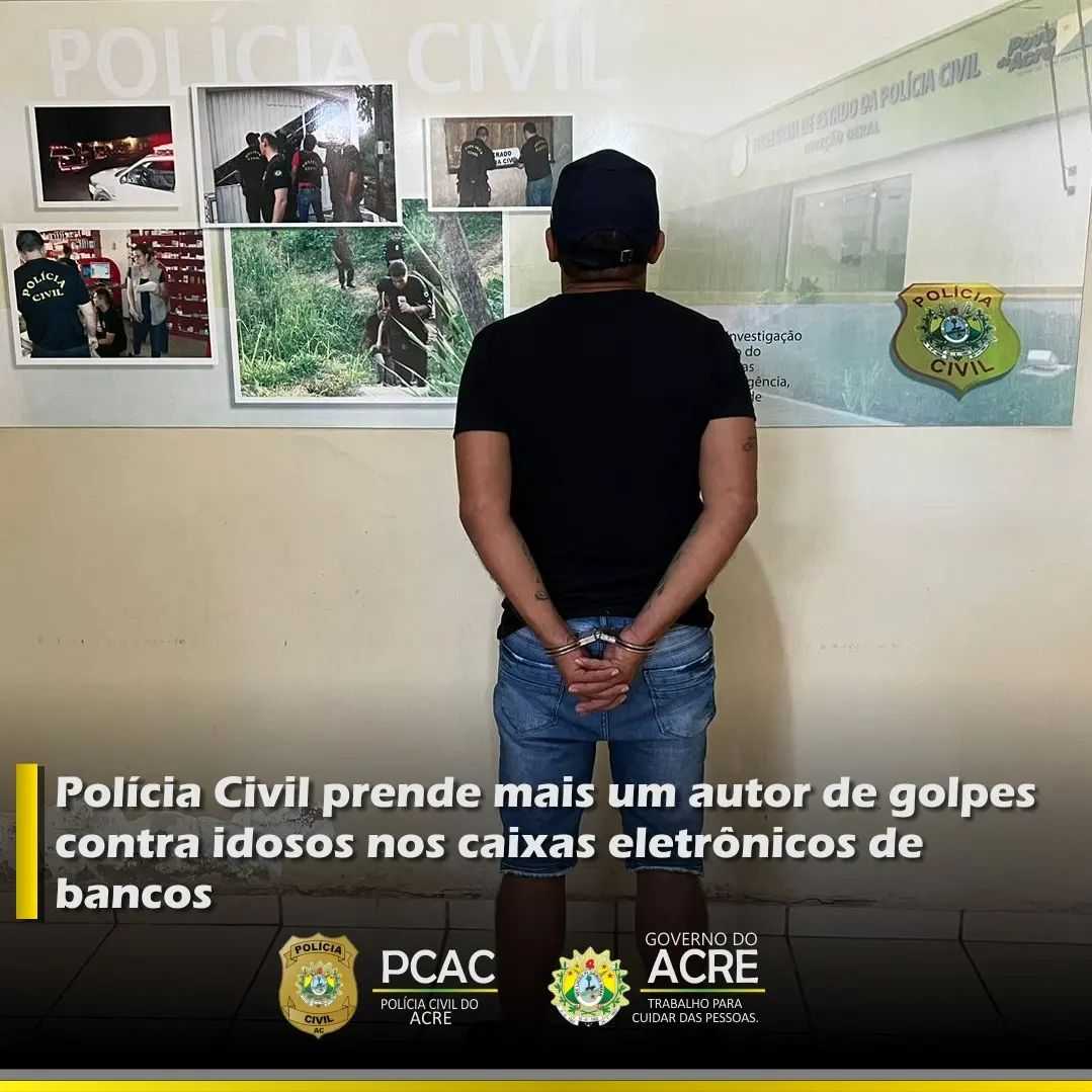 Polícia Civil do Acre (PCAC), por meio dos agentes da primeira regional prendeu mais uma pessoa do grupo criminoso acusado de aplicar golpes contra idosos nos caixas eletrônicos de bancos.